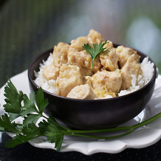 PIeces of chicken breast cooked in a smooth & creamy sauce , made with puree tomatores, cream & ground pistachio nuts.